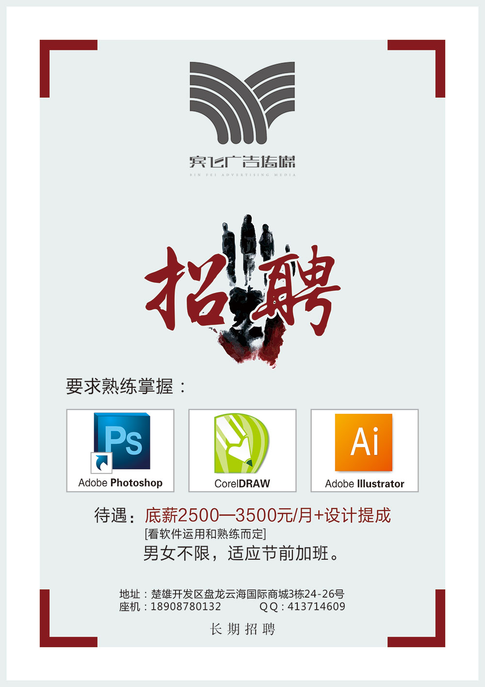 設(shè)計部地址:楚雄市開發(fā)區(qū)盤龍云海國際商城3幢一層 0878-6991011 制作部地址:楚雄市開發(fā)區(qū)飲食文化街牌坊正對興云街 0878-6991010 業(yè)務(wù)聯(lián)系:18908780132 郵箱:1546938047@qq.com ©2011-2016楚雄賓飛廣告?zhèn)髅接邢薰?All Right Reserved